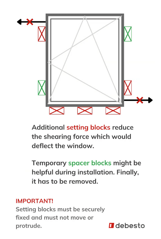 Important: Bottom support blocks must be flush with the window frame and securely fixed in place. They must not move.