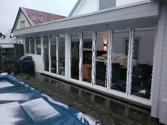 - We delivered two structures made from “warm aluminum” to frosty Sweden, in the system of folding accordion Cortizo (73 mm) doors with a thermal break in Alpine white (RAL 9010).